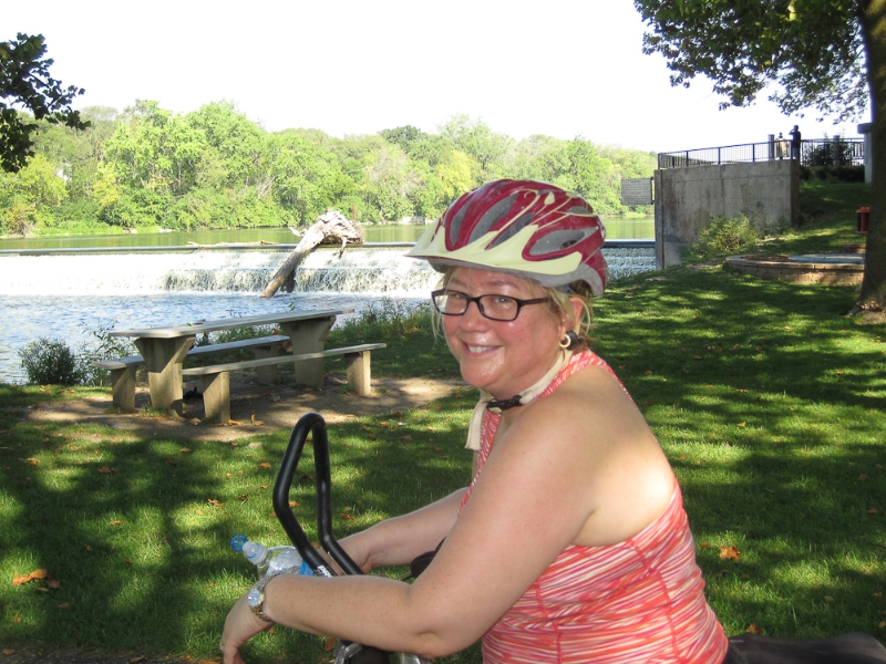 Today we biked the Fox River Bike Trail. We started at the Fabyan Windmill park on the East side of the river. We biked South, crossed the river at the State Street bridge, then biked North along the West side of the river, back to our starting point.