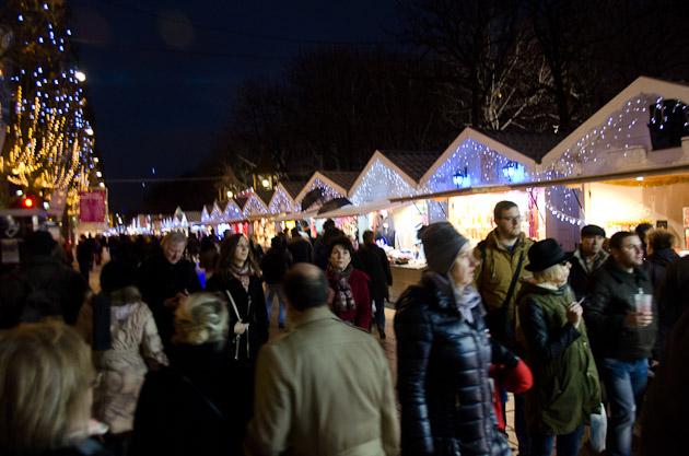 It had started raining — think hard drizzle. We started walking West along the Champs-Élysées into the Christmas Market. There were lots of people, lots of food and gift stands setup. Nice Christmas lighting and decorations. It reminded us of the Christmas Market we saw in Belgium last year, but this was bigger. We stopped to have some Champagne, but resisted getting anything to eat.