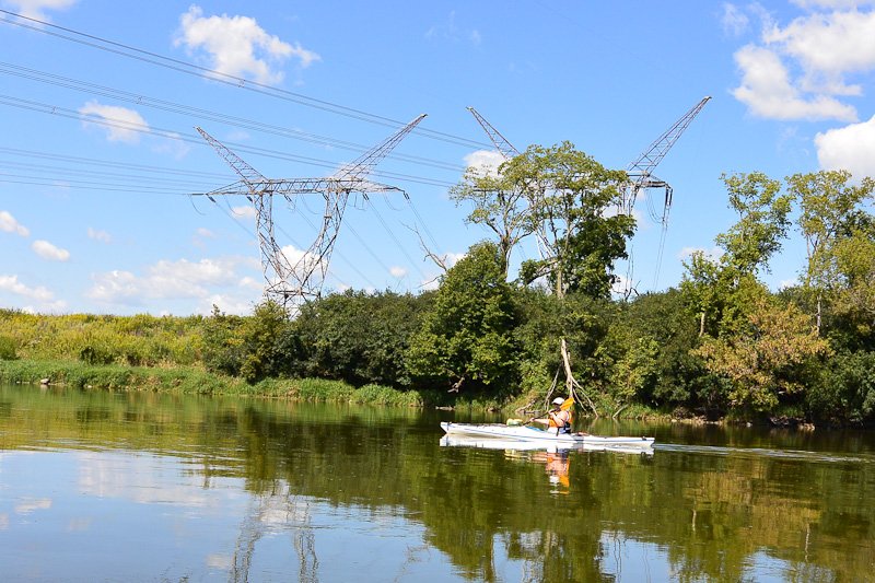 High Voltage Power lines crossing the Fox River near Silver Sprints State Park. Cathie. Kayaking Fox River: Yorkville to Millington