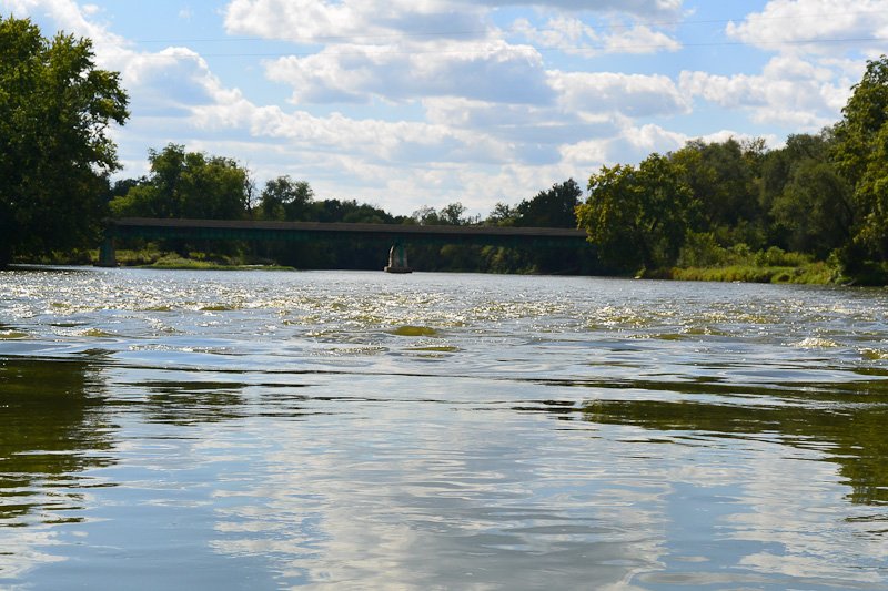 RIffles in the water approaching the Millington Bridge Street bridge. Kayaking Fox River: Yorkville to Millington