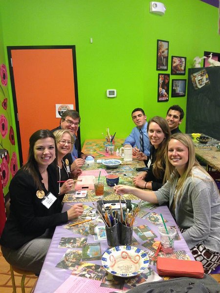 36Pottery Fun Cathie and her Old Masters hosts: Stephanie, Nick, Tom, Jess, and Stephanie glazing pottery (Jack too!). Purdue Old Masters, Nov 2014