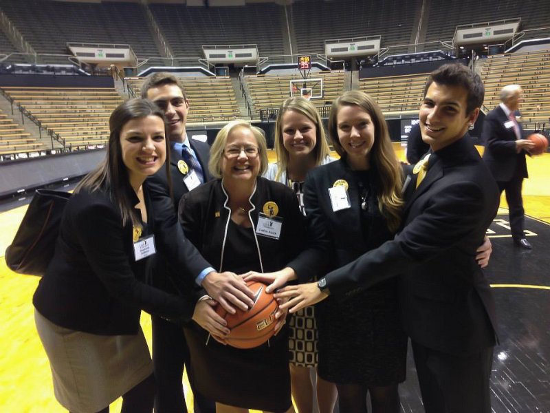 37Cathie and her Old Masters hosts at Mackey Cathie and her Old Masters hosts: Stephanie, Nick, Melissa, Jess and Tom on the basketball floor of Mackey Areana. Purdue Old Masters, Nov 2014