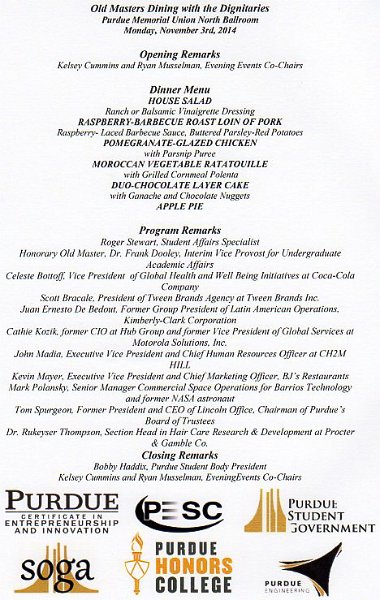 22Dining with Dignitaries Dinner Menu and Program for the Monday night dinner. Purdue Old Masters, Nov 2014