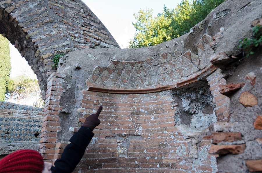 145Liane Liane pointing at brick patterns. Walking through the Ostia Antica archeological site