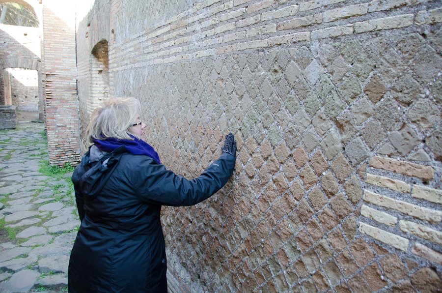 166Cathie Cathie looking at brick patterns. Walking through the Ostia Antica archeological site