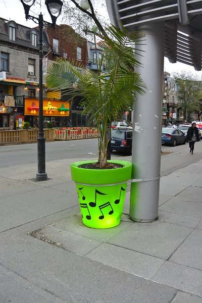 12Green lit planter. Green lit planter. Walking East and South along rue Saint-Denis, Quartier Latin. Walking Montreal Centre-Ville and Quartier des Spectacles areas