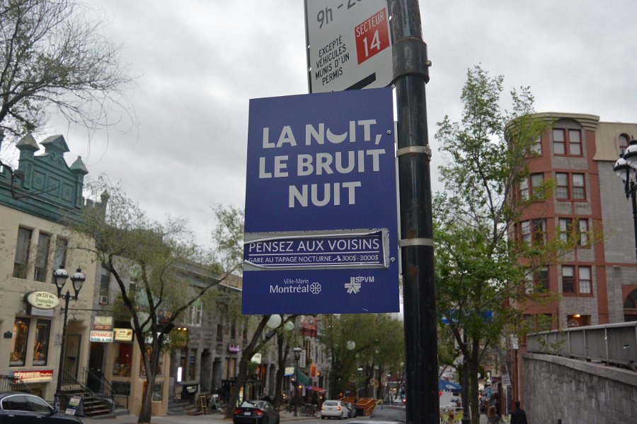 9La nuit, le bruit nuit. Pensez aux Voisins. La nuit, le bruit nuit. Pensez aux Voisins. Walking East and South along rue Saint-Denis, Quartier Latin. Walking Montreal Centre-Ville and Quartier des Spectacles areas