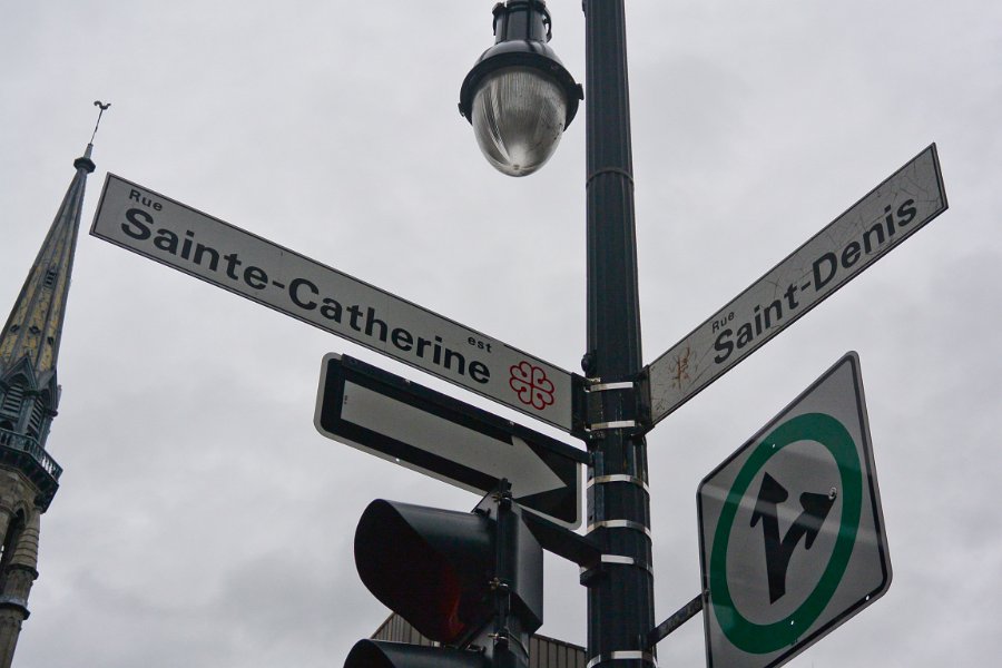 15rue Saint-Denis and Sainte-Catherine. Intersection of rue Saint-Denis and rue Sainte-Catherine. Walking West and South along rue Sainte-Catherine, Quartier Latin. Walking Montreal Centre-Ville and Quartier des Spectacles areas