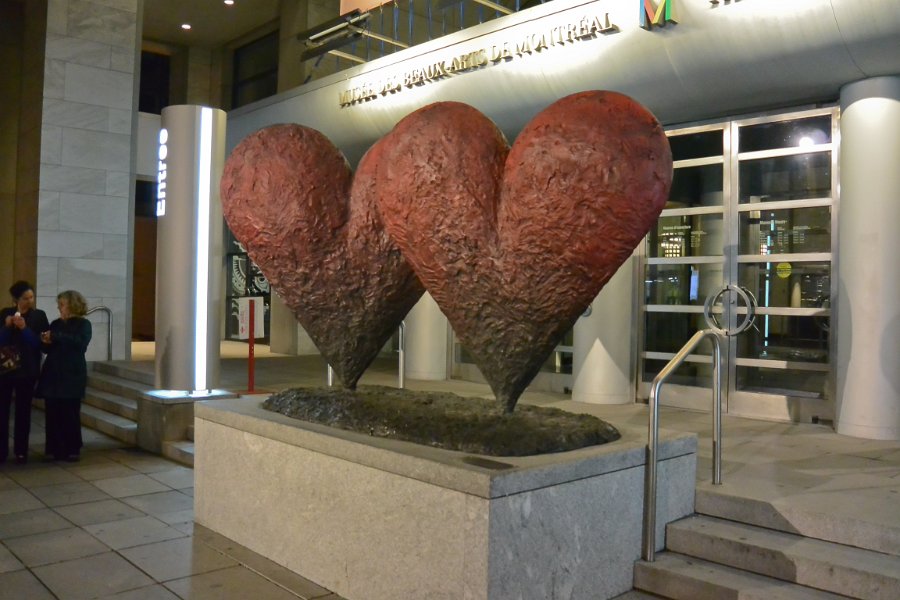 25"Coeurs jumeaux de six pieds" - Musée des beaux-arts "Coeurs jumeaux de six pieds/ Twin 6' hearts" sculpture by Jim Dune, 1999. In front of the Musée des beaux-arts, Desmarais Pavilion. Walking along Sherbrooke Street, Rue Sherbrooke.