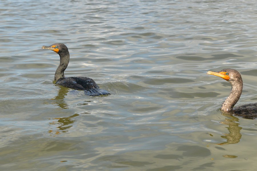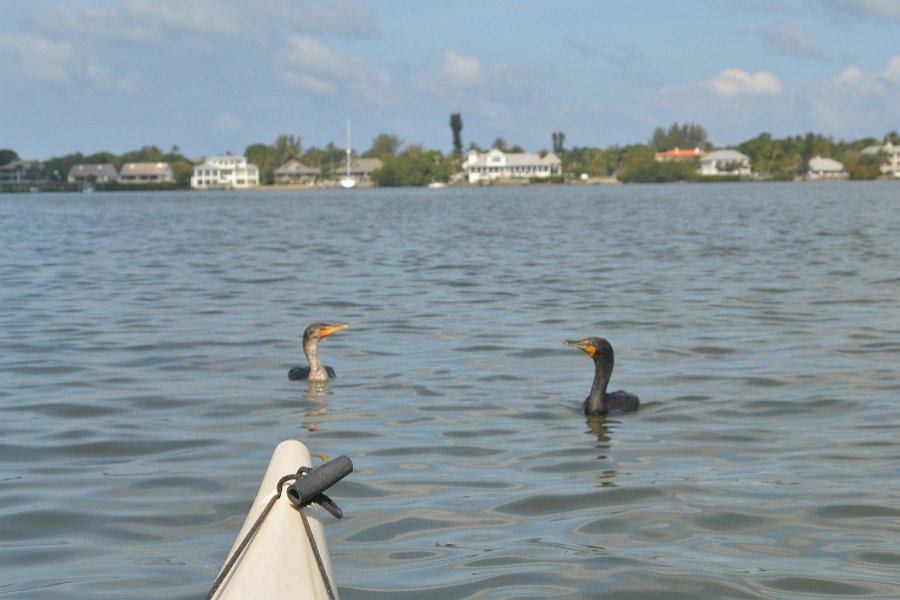 12Cormorants A 2nd cormorant joined us. They are both using our kayaks to help them with fishing. Fun!! Rounding the Northern Tip of Buck Key, heading back. Kayaking from Tween-waters Inn down Roosevelt Channel, then around the far side of Buck Kay. No wind, tide coming in.