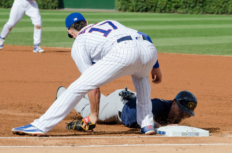 18Hernan Perez. Cubs v Brewers 9/17/16 Hernan Perez sliding into first base, Krish Bryant. Cubs vs Brewers at Wrigley Field, Cubs lose 11-3.