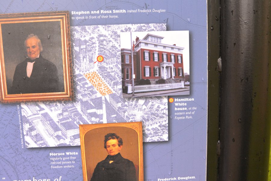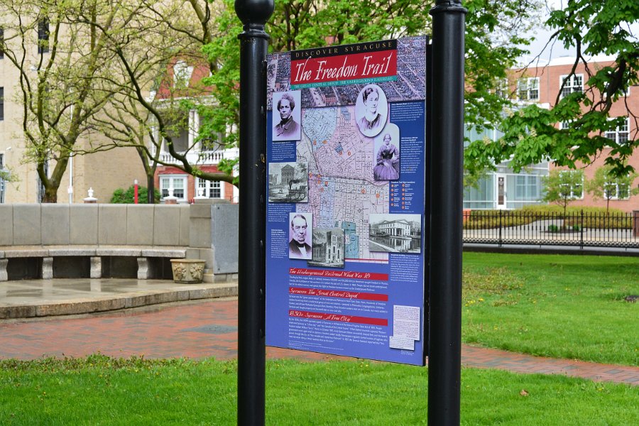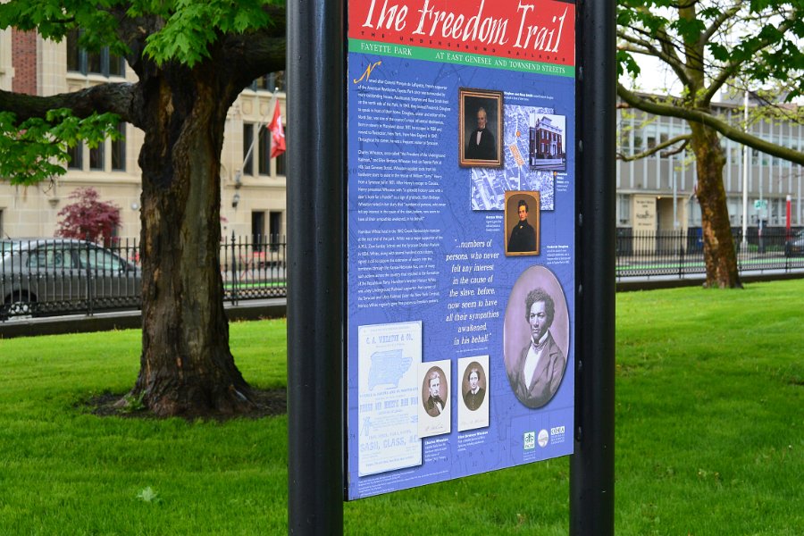 26Hamilton White House Freedom Trail signed Viewed from Fayette Firefighters Memorial Park. Downtown Syracuse walk