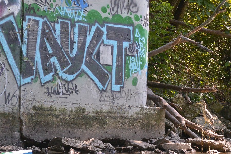 Juvenile Black-crowned Night-Heron looking at Street Art. Kayak the North Shore Channel of the Chicago RIver