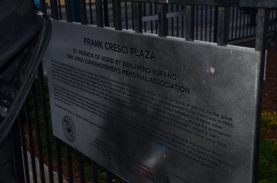 19 St Francis of Assisi statue by Beniamino Bufano, 1926-28. Walking Fisherman's Wharf area from Ghirardelli Square to Pier 39. San Francisco Cable Car loop